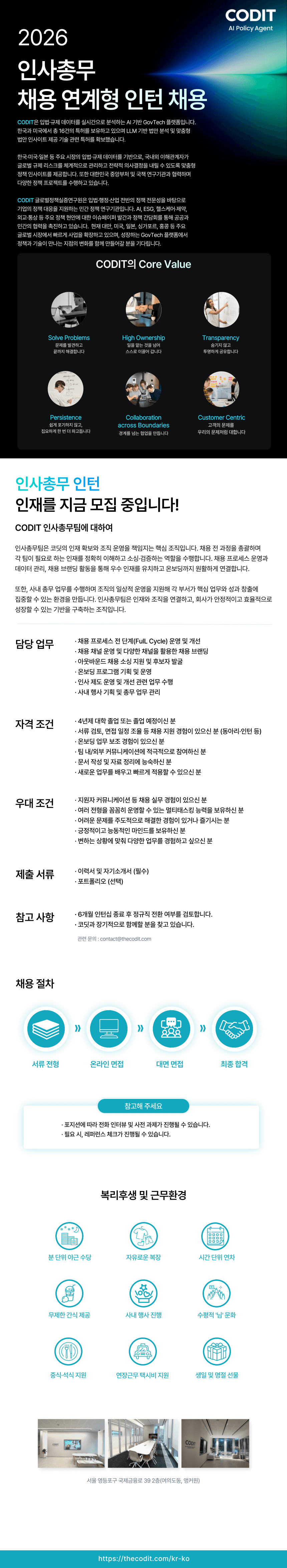 · 수집 및 이용목적 : 면접일정 및 공지사항 등 채용과 관련된 안내, 채용절차 진행에 따른 연락(면접비, 합격자 관리 등), 채용 적합성 판단 및 평가의 근거 자료, 인재 등록 및 활용